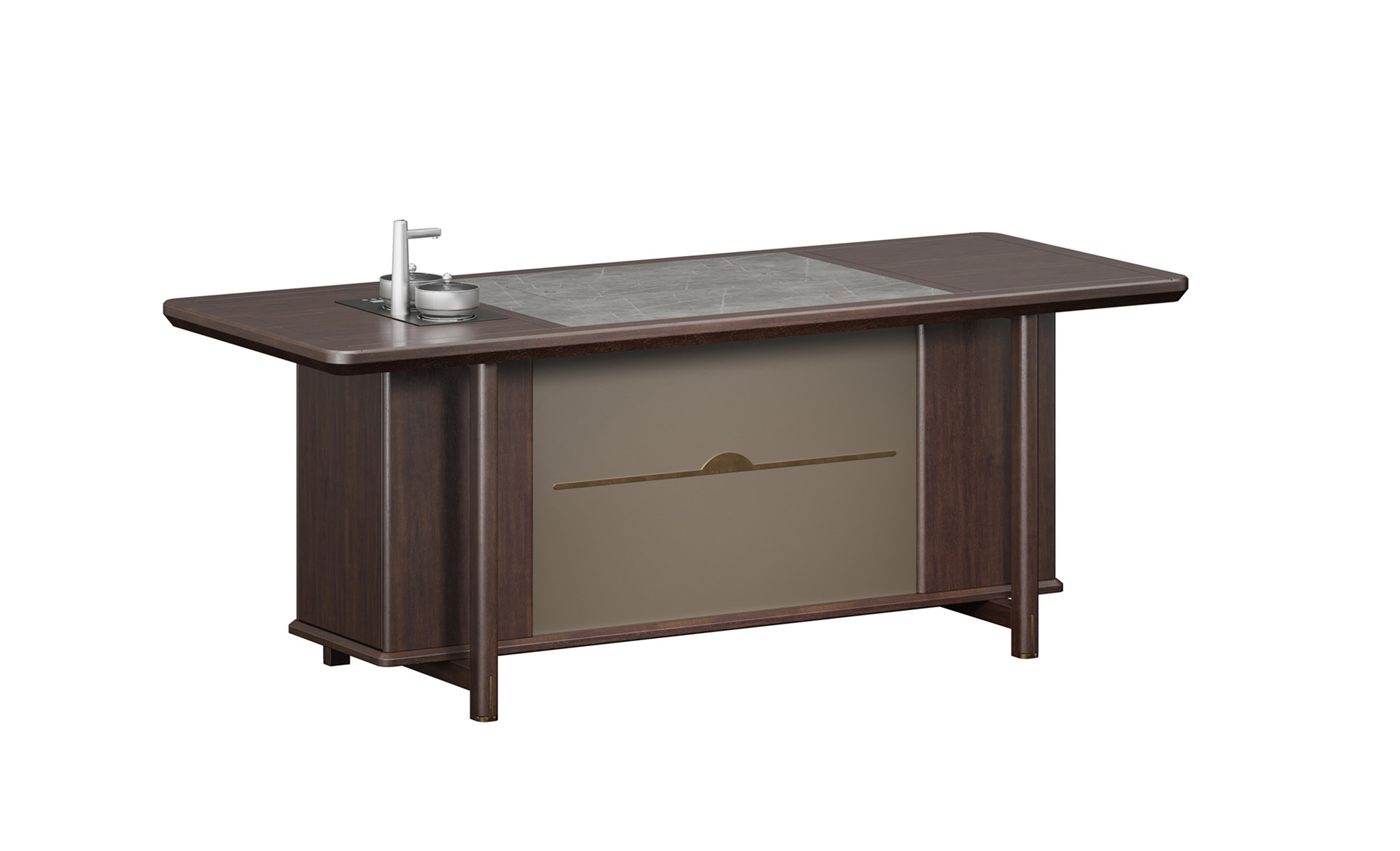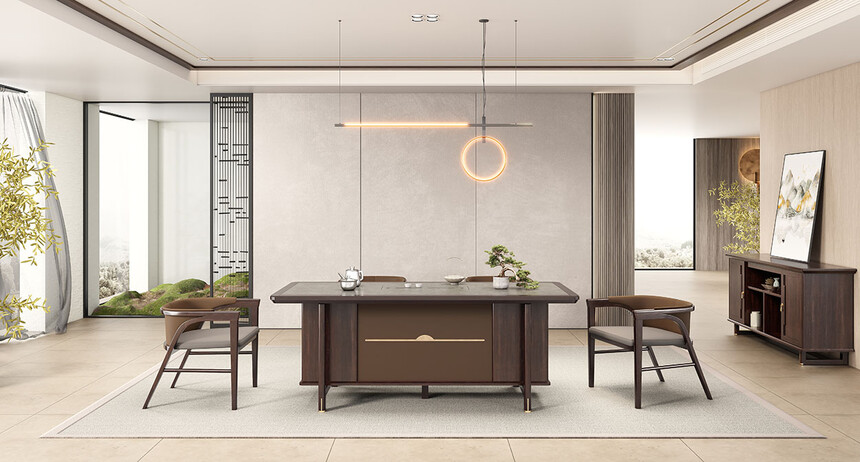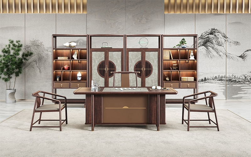 鴻泰系列在造型上主要采用硬朗簡潔的直線條,溫潤的烏金木與質樸的巖板相結合,剛柔并濟,時尚大方,既使得中式家具古典、質樸的內涵顯現(xiàn),又符合現(xiàn)代辦公追求的時尚感、實用性。