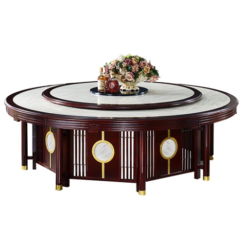 高檔飯店新中式實木飯桌電動大理石餐桌圖