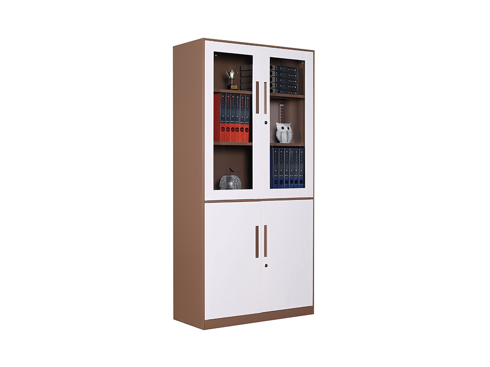 ● 一體結構設置,上部玻璃對開門,內(nèi)置1層層板可調(diào)高度,內(nèi)置物品可視,便于拿取,中間2個抽屜,下部對開鐵門、門內(nèi)一格板,設置有拉手和鎖。