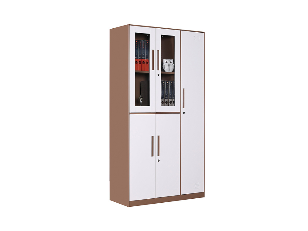● 一體結(jié)構(gòu)設(shè)置,上部玻璃對(duì)開門,內(nèi)置1層層板可調(diào)高度,內(nèi)置物品可視,便于拿取,中間2個(gè)抽屜,下部對(duì)開鐵門、門內(nèi)一格板,設(shè)置有拉手和鎖。