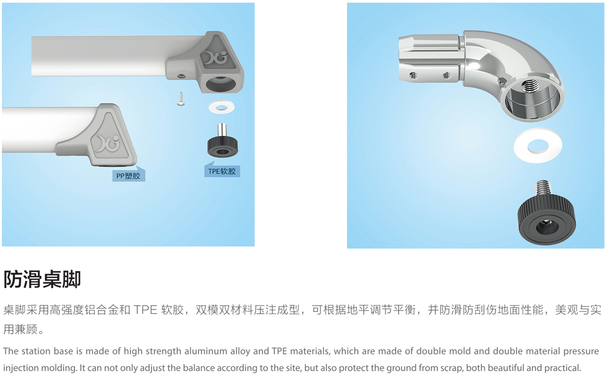 5.桌腳掌:1.5mm壁厚,腳套底有4個平衡調(diào)節(jié)機構(gòu)。