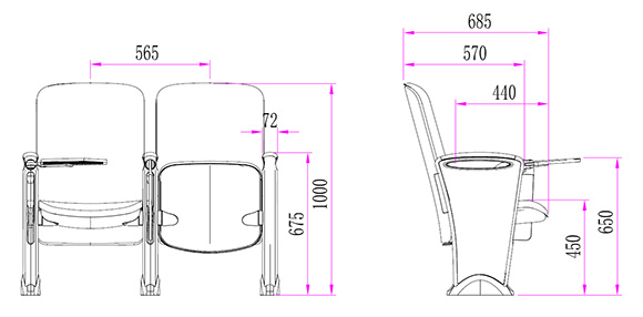 2.座椅基本中心距為565±10mm,座包打開側深685±10mm,座包深度440±10mm,基本椅高為1000±10mm。