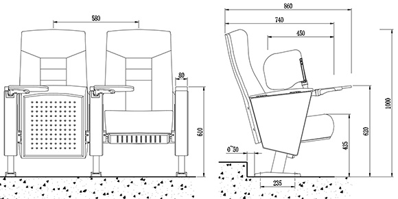 2.座椅基本中心距為580±1.0mm,座包打開(kāi)側(cè)深720±1.0mm,寫字板打開(kāi)側(cè)深860±1.0mmm,基本椅高為1000±1.0mm。最小排距:900mm。