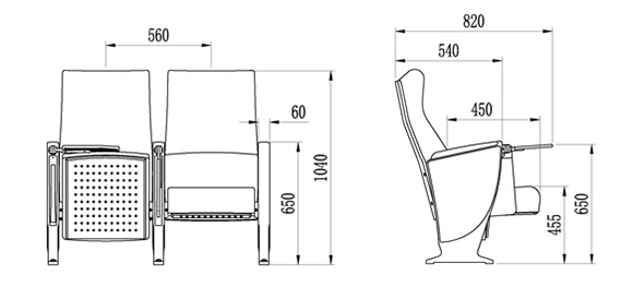 2.座椅基本中心距為560±10mm,座包打開側(cè)深450±10mm,寫字板打開側(cè)深820±10mm,椅高為1040±10mm,最小排距:950 mm。通過相關(guān)家具產(chǎn)品質(zhì)量檢驗中心QB/T2602-2013《影劇院公共座椅》的相關(guān)檢測依據(jù),甲醛釋放量≤0.120mg/m3h;抗引燃特性符合GB 17927.1-2011中的要求。