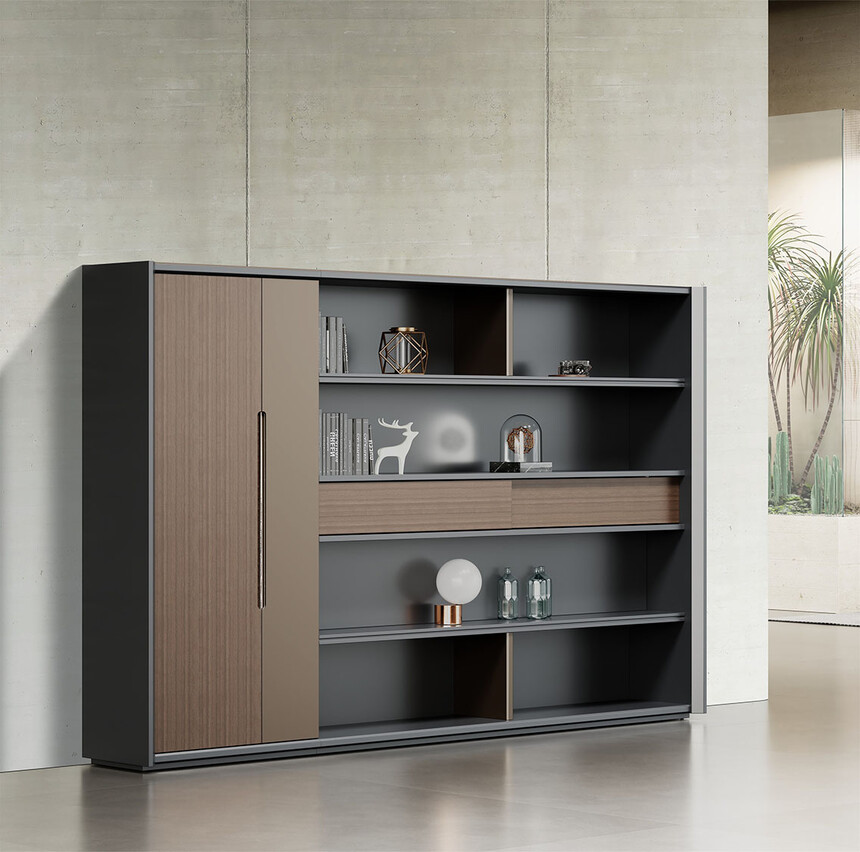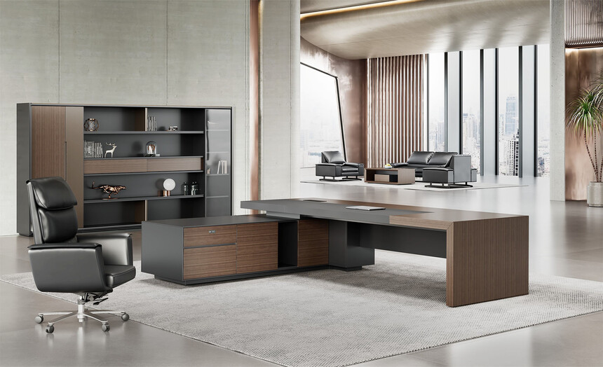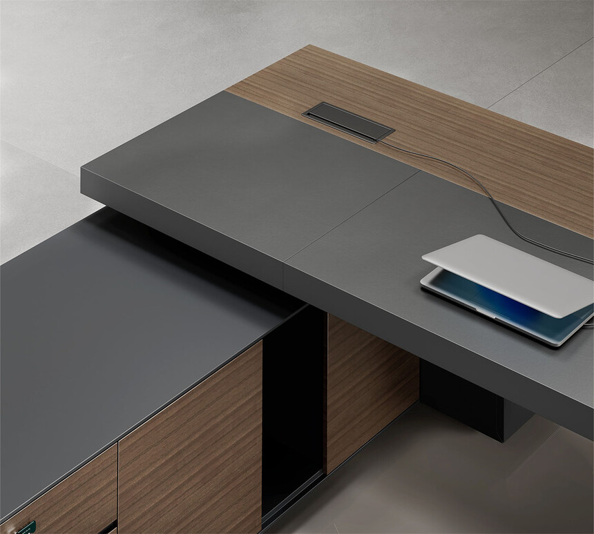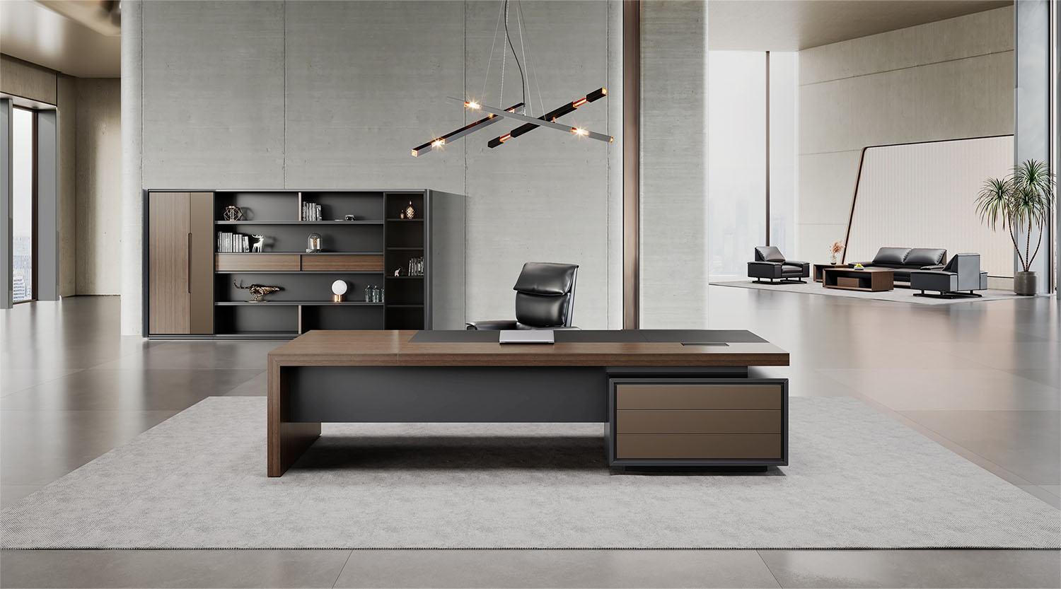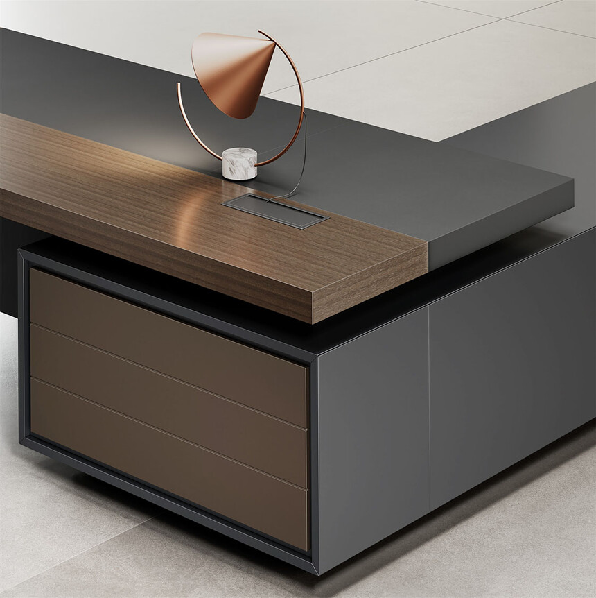 明哲系列辦公家具,采用直紋胡桃和星空灰實(shí)色漆元素,高檔實(shí)木質(zhì)感飾面,深邃飽滿(mǎn),紋理清晰,內(nèi)蘊(yùn)深厚。搭配簡(jiǎn)約端正的造型設(shè)計(jì),臺(tái)腳的斜切裝置,還有產(chǎn)品的布局變化,錯(cuò)落有致,承前啟后,展現(xiàn)極致簡(jiǎn)潔和視覺(jué)效果的完美詮釋。低調(diào)又不失時(shí)尚,穩(wěn)重又不失靈動(dòng),既營(yíng)造現(xiàn)代時(shí)尚的情緒,還給當(dāng)今辦公環(huán)境注入明亮、輕松的舒適感。